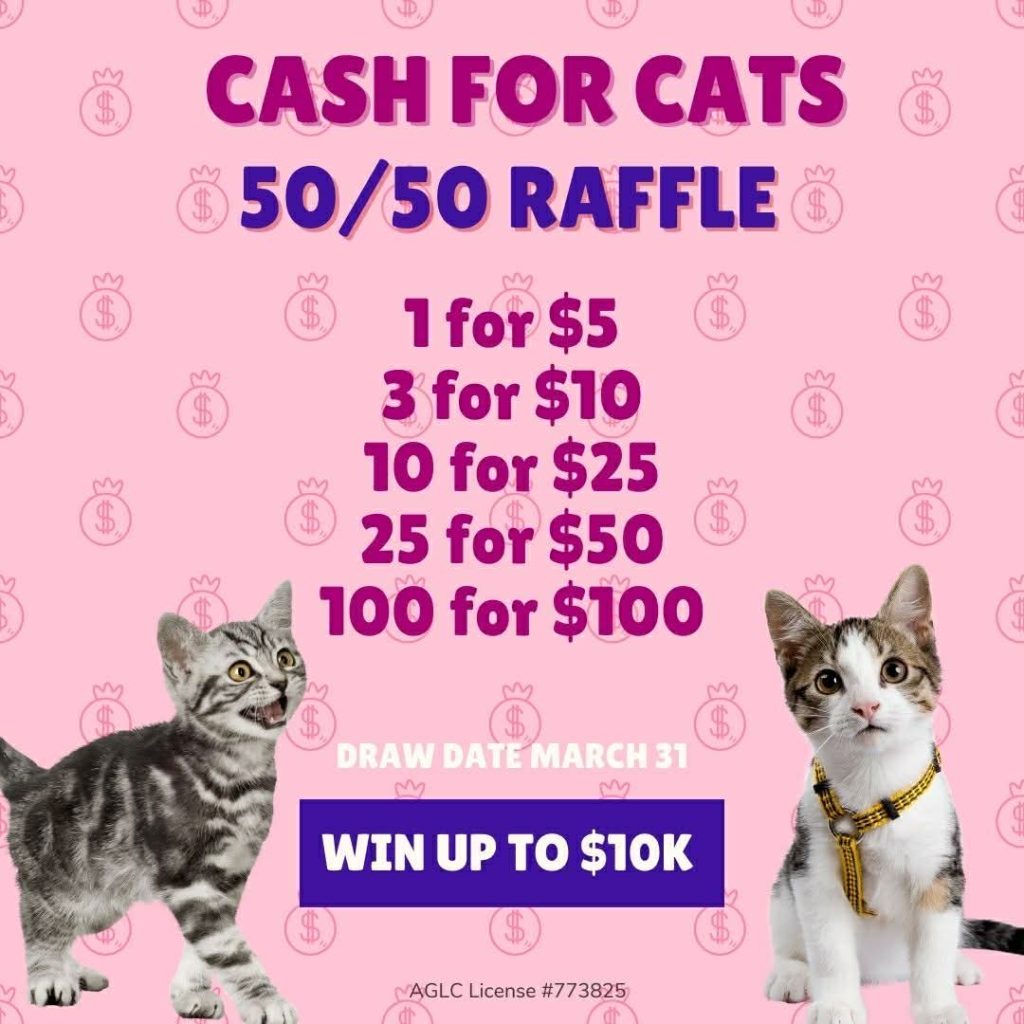 A 50/50 raffle to support the cats in our care and help us get ready for kitten season. Proceeds will go to medical care and supplies for cats. Together, we can help kitties!